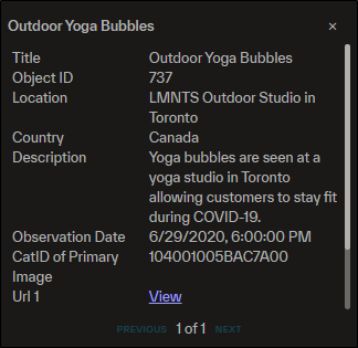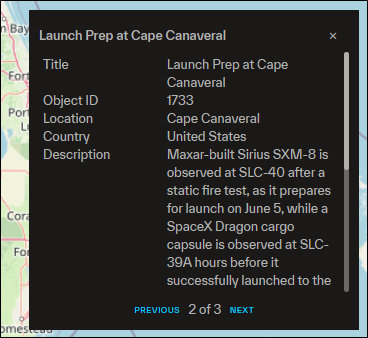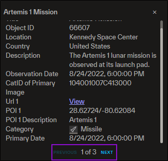Select any FocalPoints icon to see metadata pertaining to the recent event or point of interest at that location. See Available Metadata Fields.