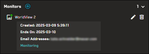 Create a monitor to receive an email notification when new imagery acquisitions intersecting a monitored project are available in Hub. If multiple people need to receive an alert about the new imagery acquisitions, add additional recipients to the monitor. You can edit and delete monitors at any time.
