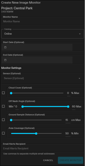 • Monitor Settings (Optional) Add monitor filters to receive an alert if new imagery matches your filter settings. Imagery that does not match the filters will not trigger an alert. You can set the following filters: