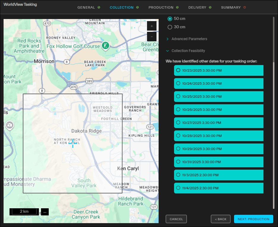 2. Complete each page of the WorldView Tasking wizard to define the parameters in your tasking request.