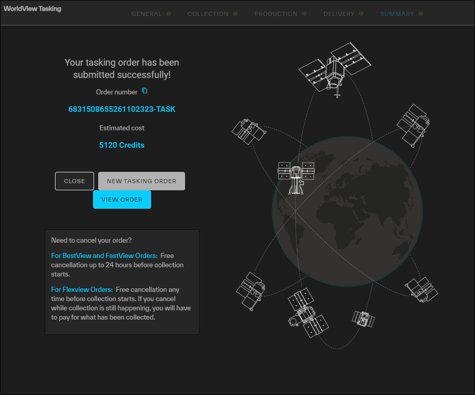 • Tasking requests are based on a number of factors, such as priority, demand, and other order parameters. Additionally, your tasking order may result in the collection of multiple images. Tasking requests use an escrow system rather than metering the quoted number of credits against your credit plan limit upon placing the order.